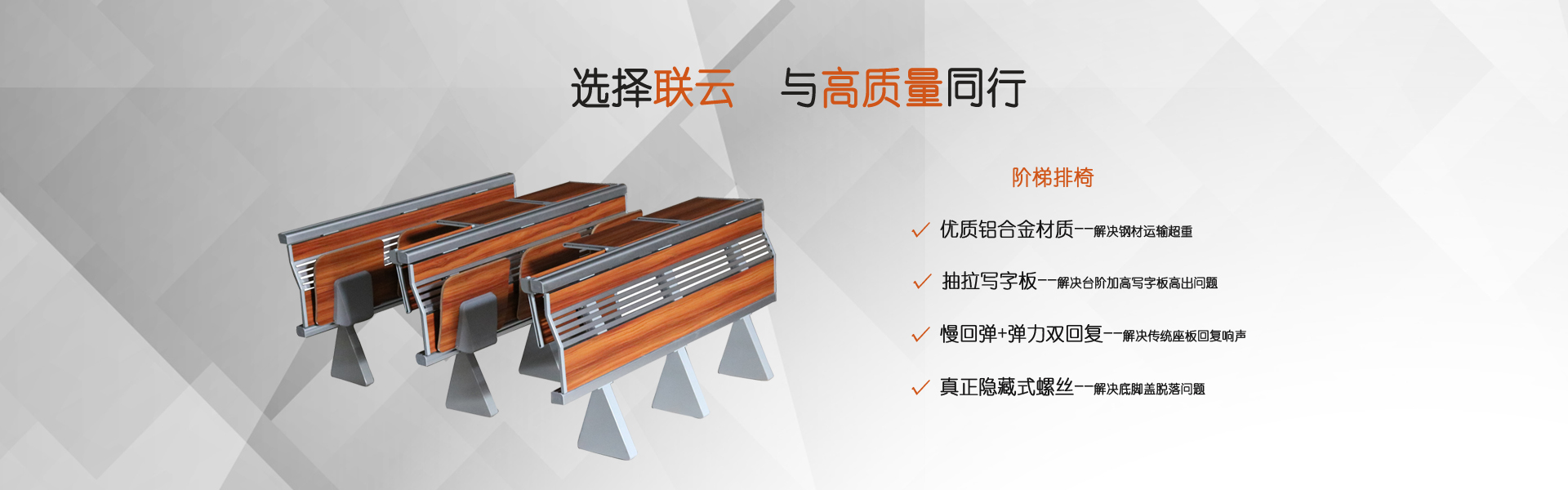佛山聯(lián)云是廣東一家專業(yè)生產(chǎn)禮堂椅、階梯排椅、課桌椅、等候椅的廠家。產(chǎn)品符合人體工學(xué)原理的坐墊、靠背、扶手,環(huán)保優(yōu)質(zhì)的表面織物和舒適柔軟的填充物質(zhì),日臻純青的制作工藝,兼顧唯美造型與多樣化實用功能,聯(lián)云對每一個細節(jié)都努力用心,只為給你創(chuàng)造超越身心的完美體驗。